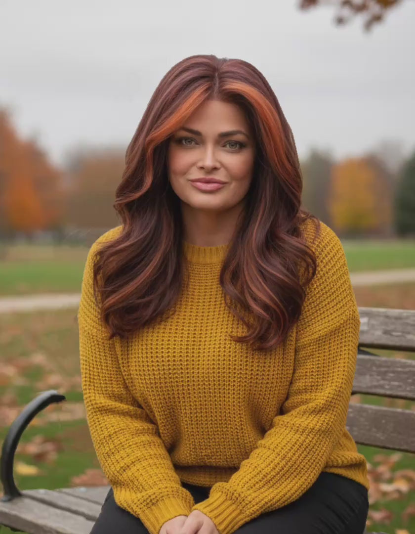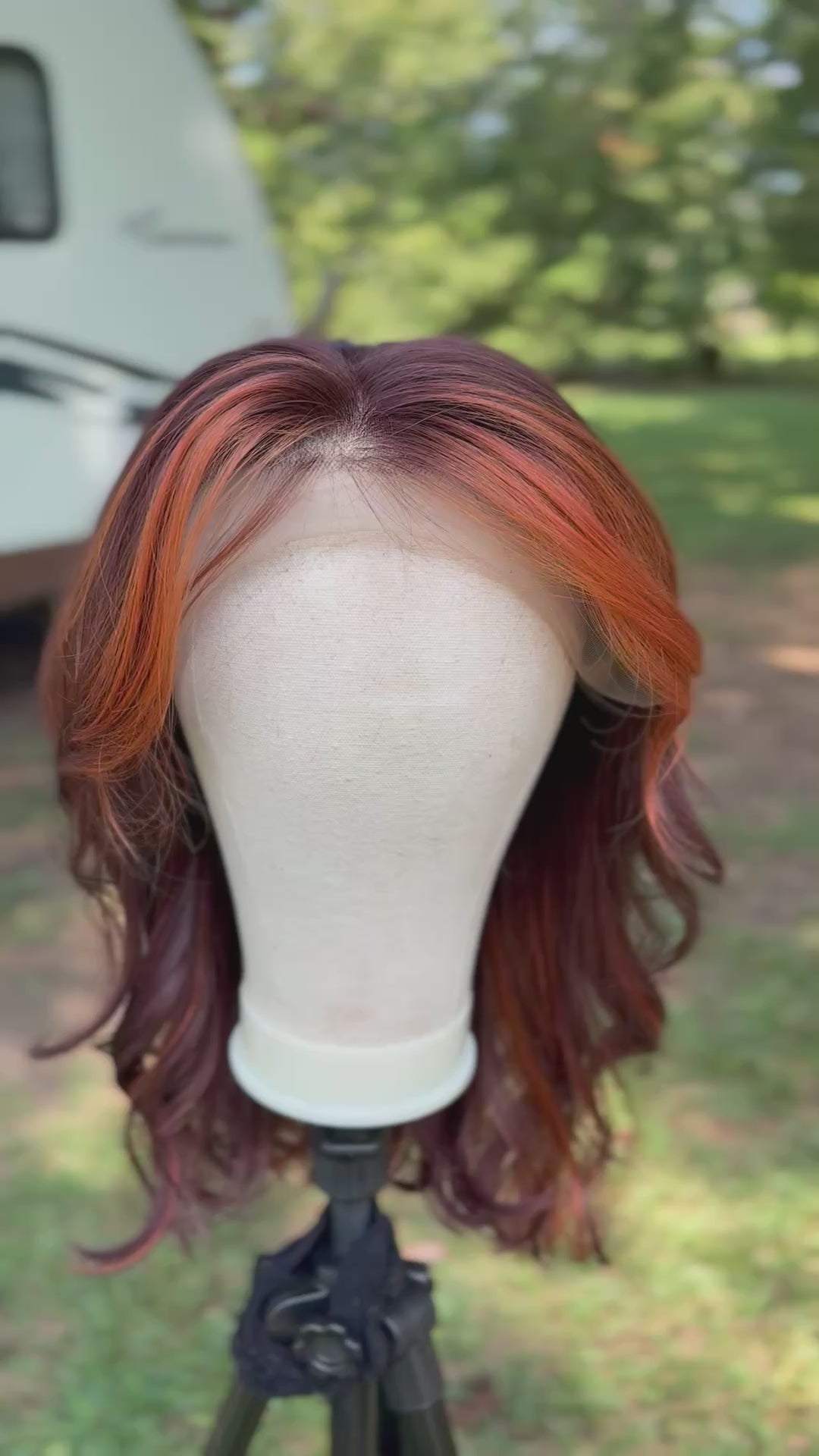 Experience the OZZY 13X4 Luxe Lace Front wig, crafted with premium heat-resistant Futura synthetic fibers for durability and styling versatility. Featuring a free part and customizable 22-24" loose curls with curtain bangs and layering, this low-density wig offers a natural look. Its stunning dark brown base is enhanced with copper and orange money pieces plus subtle highlights for dimension. Designed with adjustable straps, combs, and a standard cap size, BRAILEE ensures a secure, comfortable fit. Expertly customized by WBR for a flawless finish.