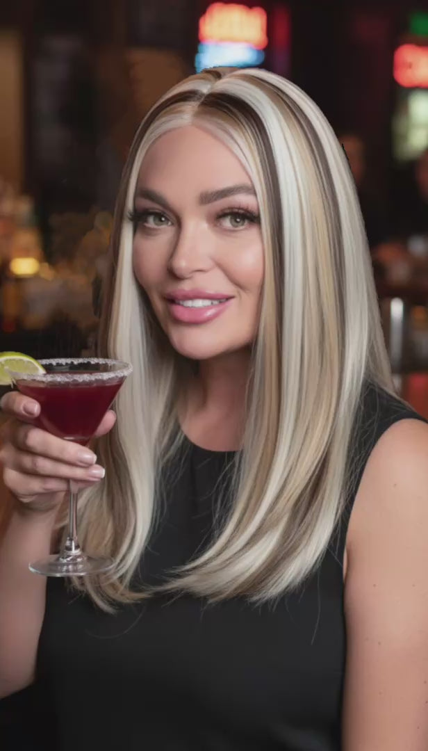 The CALICO wig features a 13 x 3 lace front with a free part, crafted from premium heat-resistant synthetic fiber for versatile styling. Measuring 16 inches, it showcases layered Utah curls in a stunning blend of platinum, brown, and warm blonde tones. The wig comes with adjustable straps and a standard cap size for a secure, comfortable fit. It can be worn straight without customization or tailored by WBR for an additional fee, offering expert styling options to suit your preferences.