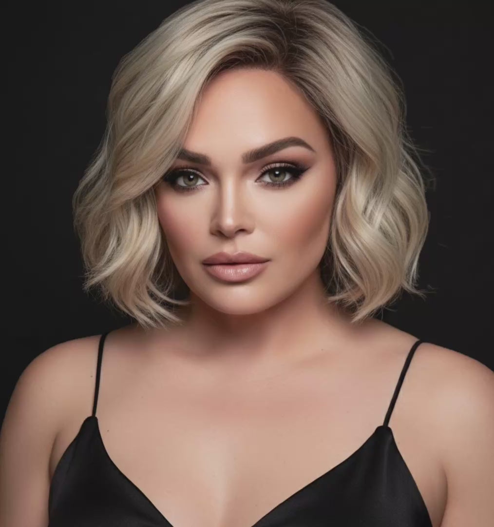 Introducing DAISY, a luxury wig with stunning natural blonde color and rooting, featuring a full monofilament lace front for a realistic hairline. With a free part, adjustable velcro straps, and open wefted design, this wig is perfect for a comfortable and customizable fit. Made with premium heat resistant Futura synthetic fibers, this 10" loose body wave wig with wispy ends is perfect for any occasion. Available in petite to standard cap sizes.