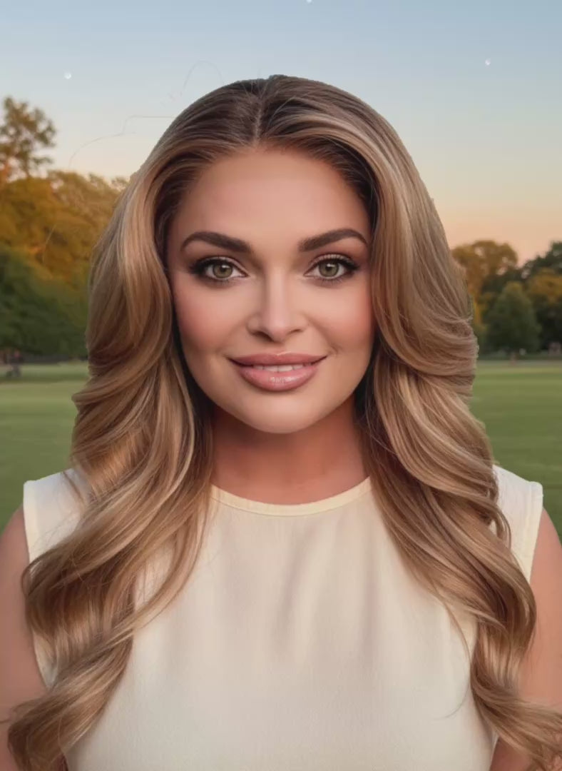 Introducing PEACHES - a stunning 24 inch loose curl with layers, featuring 13 x 3 lace front and a free part for versatile styling. Made with premium heat resistant synthetic fiber for a realistic look. Adjustable straps and a standard cap size ensure a secure fit. Perfect for achieving a Scandinavian hairline in a beautiful dark blonde shade.